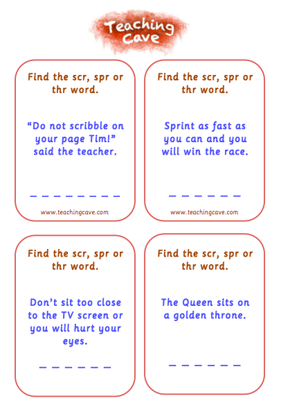 The second group activity cards focus on words that have more than four letter to challenge your more able children. Words such as skirt, snail, snake, stamp, swing, smile, speed and skate are some of the many words the children can create.