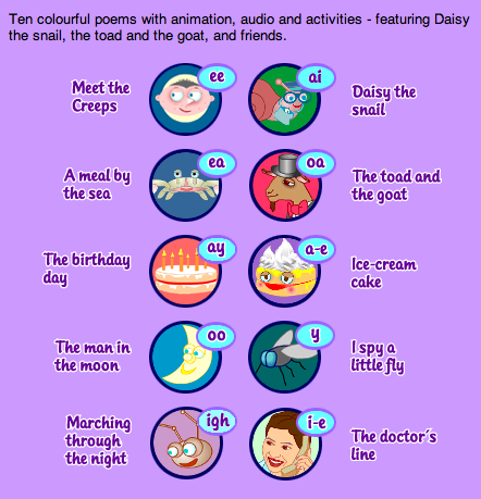 The game looks at ee, ea, ai, ay, a-e, oa, oo, y, igh and i-e.