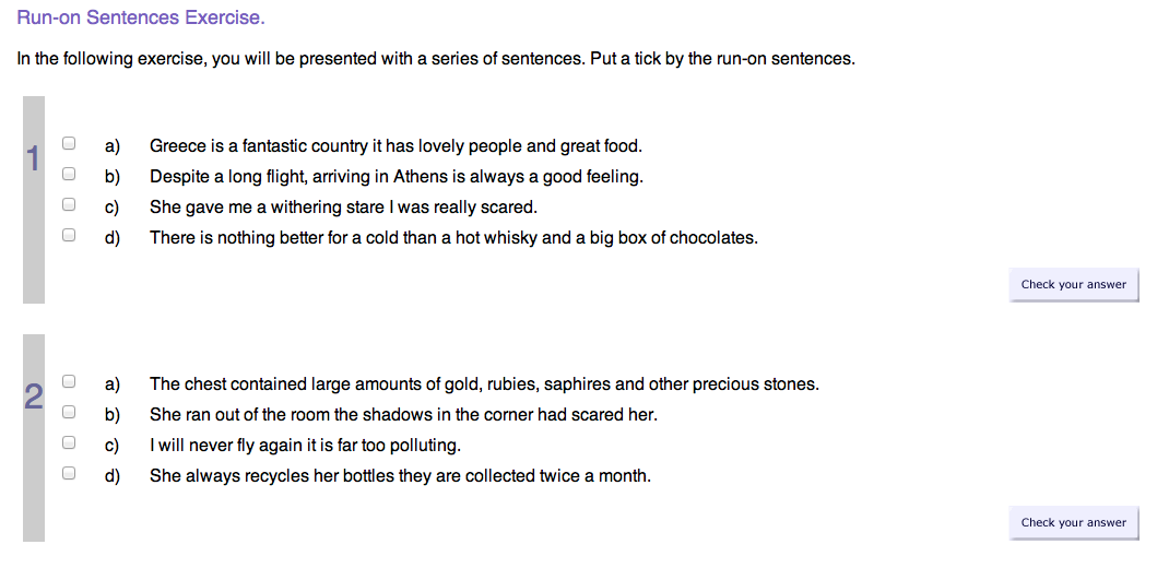 The children must tick the sentences that are run-on. They could also write the sentences in their book adding in the missing punctuation.