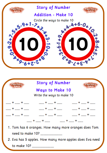 In the top resource card, your children must circle as many ways to make 10 as they can. They must be sure to count carefully as not all the sums add to make 10. Each sum is separated by a dash.