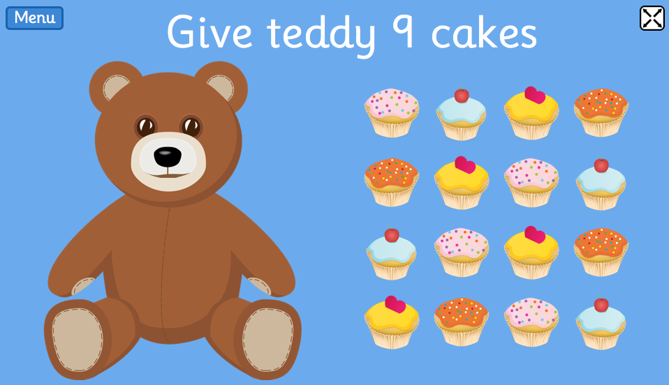 In the game, the children must read and drag the amount of cupcakes on top of the teddy.
