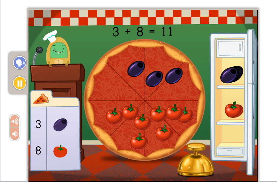 Once the children have placed the correct number of ingredients on the pizza, the sum is displayed with the answer.