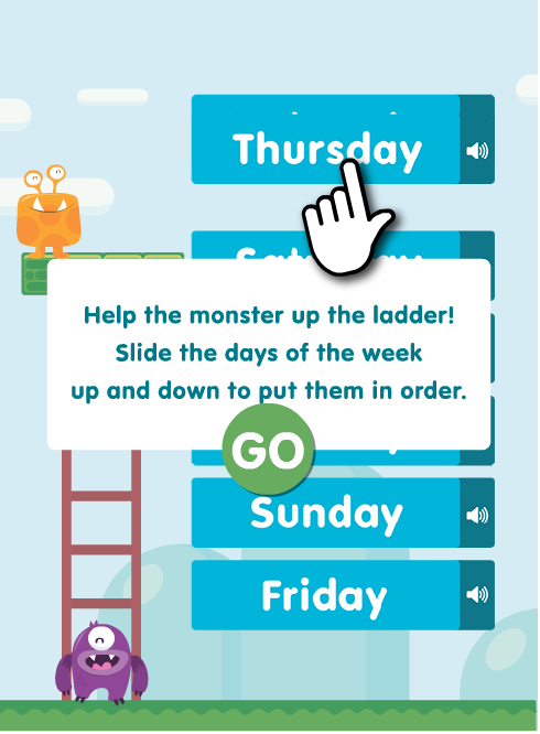 Your Foundation Stage children must slide the days in to order to help the monster climb the ladder.