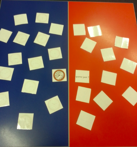 Play a simple game of snap to assist with analogue time recognition and word recognition. You could also do this with digital time.