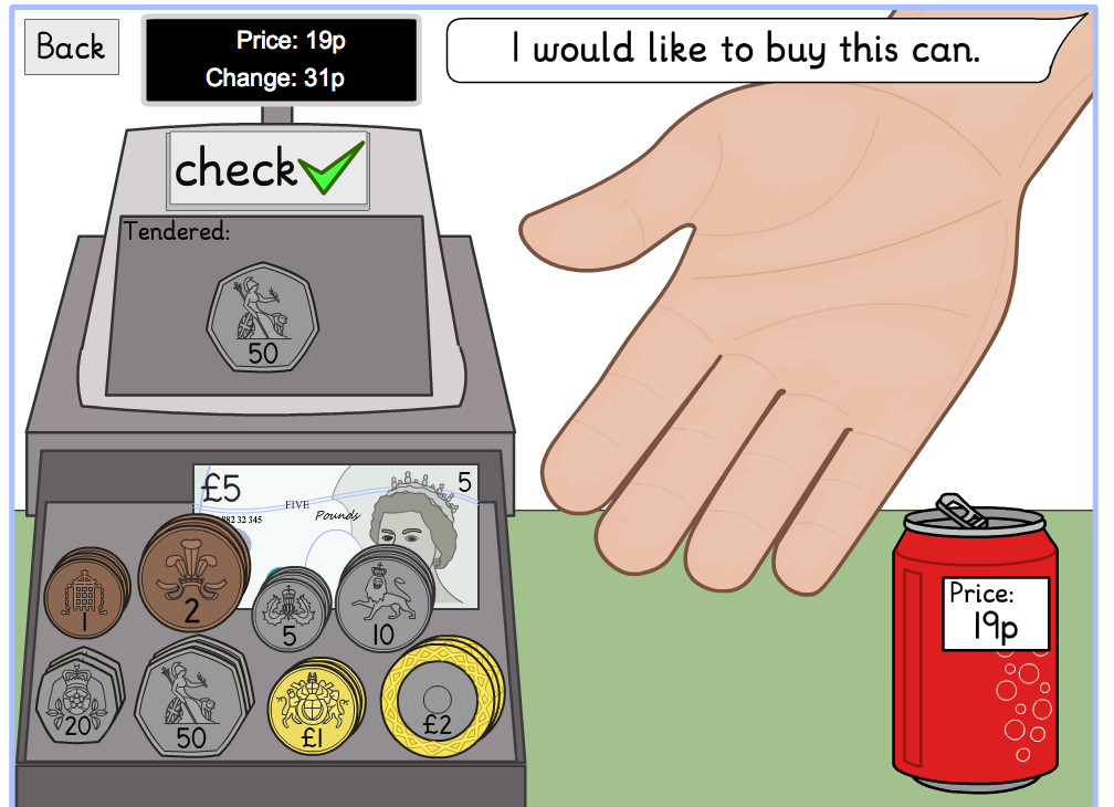 A KS1 money game where teachers and pupils can choose items to buy and then pay for them by dragging coins onto a hand. Uses coins 1p to 50p to a maximum total of £2.00.