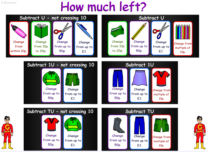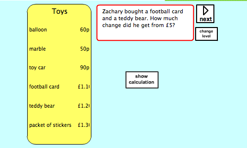This resource is broken down into stages depending on the level of your children and gives the children a simple problem, ‘I had 45p to spend. I bought one thing and now I have 20p left. What did I buy?’