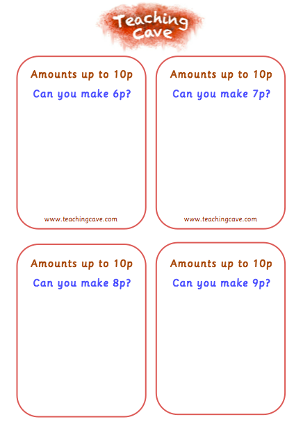 The children can use 1p, 2p, 5p, 10p coins to help create the total given on the card.
