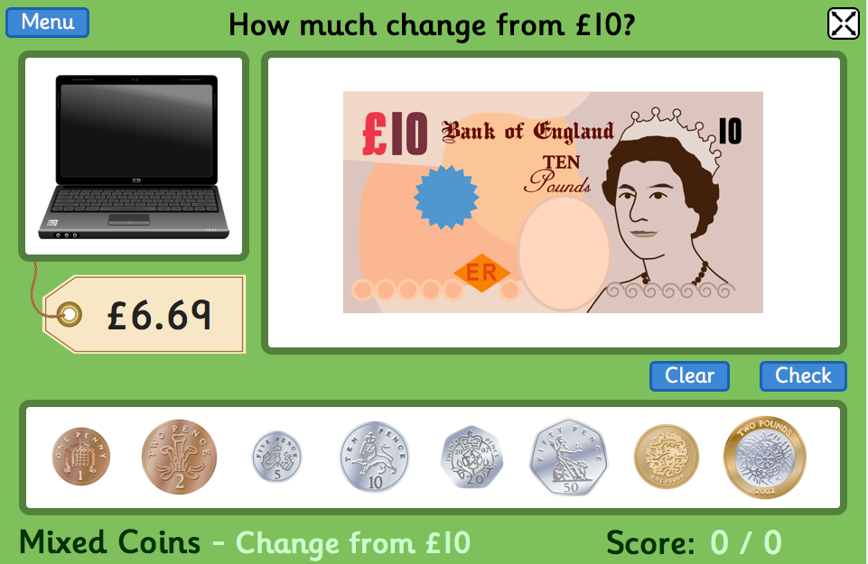 This game is broken into two sections. First, you can allow your children to calculate the change from a chosen amount.