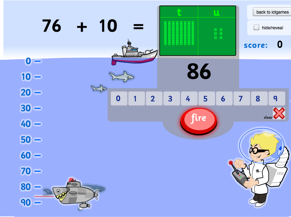 The children will think about how the tens change and units stay the same. The children must type in the answer. The depth charger will then blow up the enemy sub.