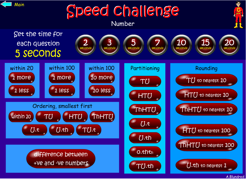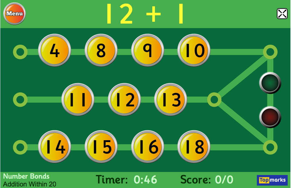 Hit the Button is an interactive maths game with quick fire questions on number bonds, times tables, doubling and halving, multiples, division facts and square numbers.