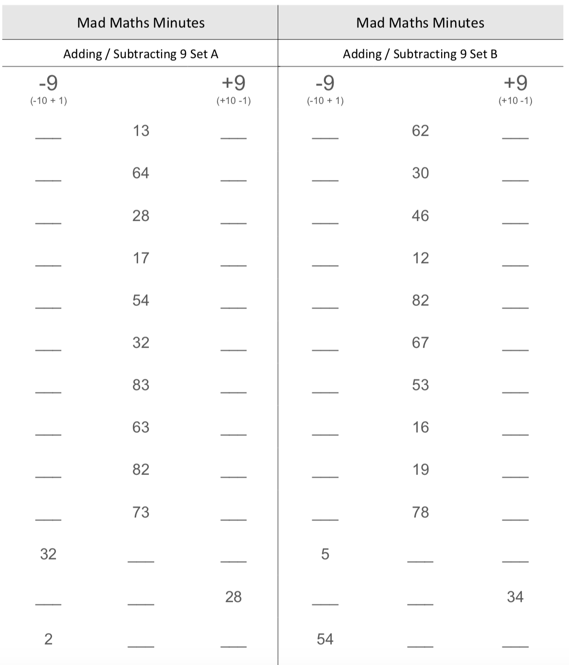 A useful worksheet that allows your class to work on adding and subtracting 9.
