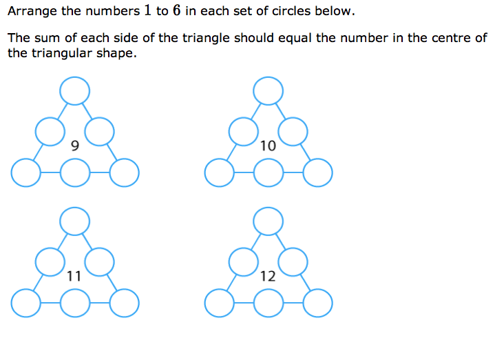 The sum of each side of the triangle should equal the number in the centre of the triangular shape.