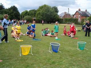 Don’t place the hoops too far away as developing the technique is important. The children will quickly realise that if they push the bean bag towards the ground the bean bag will skim out of the hoops. You are looking for a high throw that will not skim along the ground.