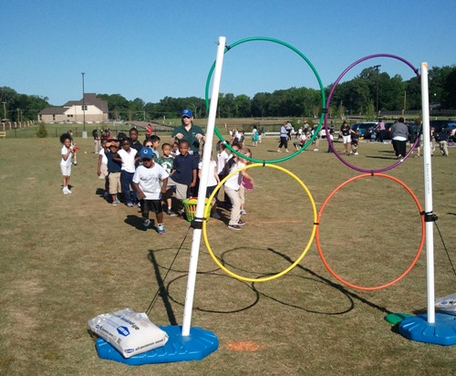 Start introducing the shot put by encouraging the children to throw for accuracy not distance. You can do this by placing different sized hoops in an area that the children can throw a bean bag or ball inside (depending on the surface).