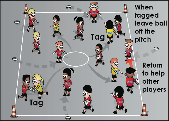 The children will be split into two teams. The idea is to keep the ball by passing to your team-mates. If you are tagged or your tag has been removed then you must run and place the ball outside the area and run back in to join the now defending team. A player from the opposing team will pit it up and pass to their team to keep it as long as they can.