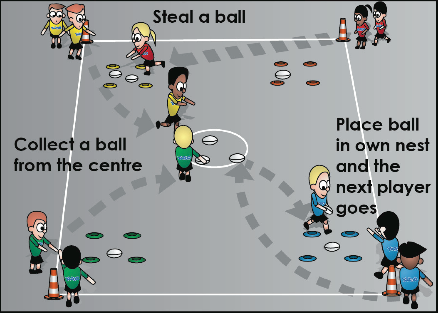 Arrange the players into four groups, one group at each corner of the grid in a single file line facing centre. Place a ring of cones (the empty nest) a metre from the corner towards the centre spot. In the centre of the grid place a larger nest containing all the balls. The game starts by the player at the front of each line running to the centre nest, collecting a ball and returning to place it in their own nest. They may then touch player two to trigger their turn (as in a relay). The players now have option to collect from the centre or steal from another team’s nest in order to build their collection. This relay continues until one team has three balls in their nest.