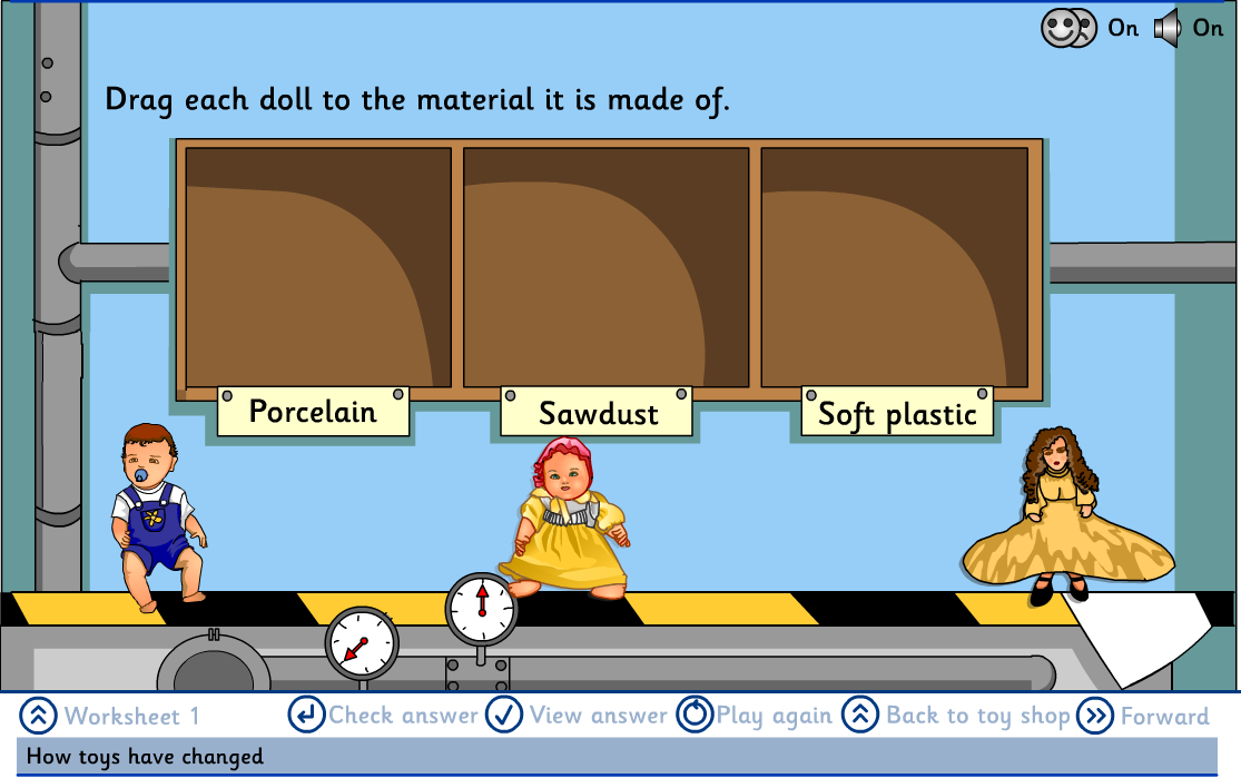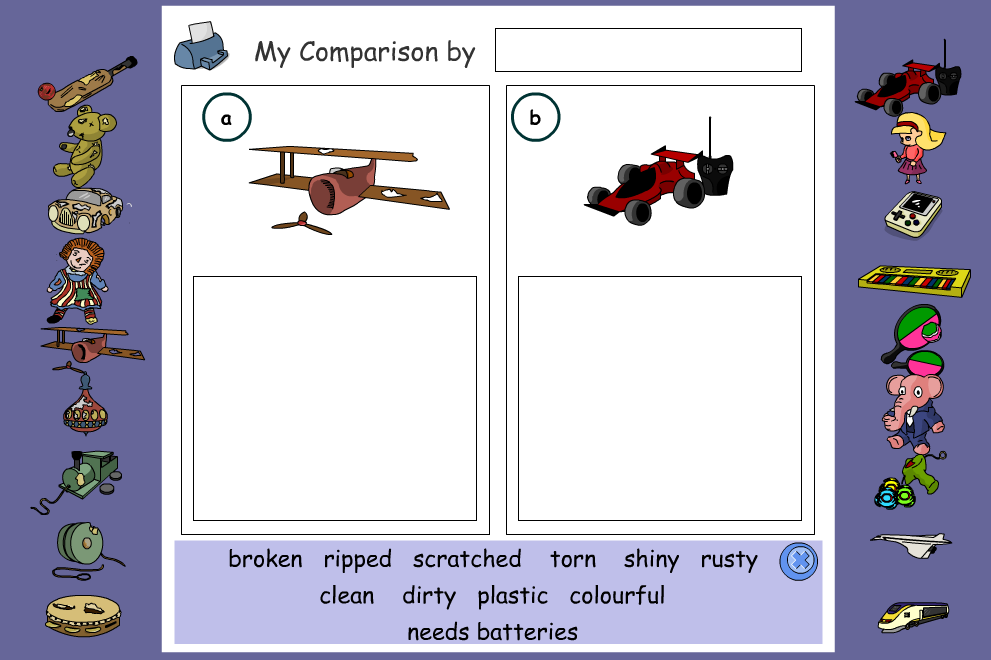 This interactive resource enables children to explore the different toys that they would have today. The children could think of a few more that are not on the screen and make a simple list. Next they could click on the newspaper and travel back in time. The next image shows the toys that were popular in the 1950s. The children could explain how the toys are different and compare the two in terms of materials, size, colour etc. This is a great opportunity for a talking and listening activity.