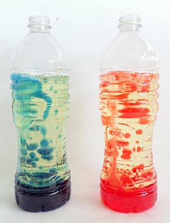 The oil floats on top of the water because it is lighter than water. The food colouring has the same density as the water so it sinks through the oil and mixes with the water. When you add the tablet it sinks to the bottom and starts to dissolve. As it dissolves it releases carbon dioxide. Gas or air, is lighter than water so it floats to the top.