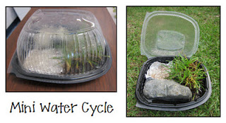 Water on the earth is constantly moving. It is recycled over and over again. This recycling process is called the water cycle. This is a mini water cycle. Add a rock to represent a mountain, grass for the vegetation, and a small pond made from alluminium foil and filled with water. To power up the water cycle, you close the container and put it in the sun. To find out more Click Here.