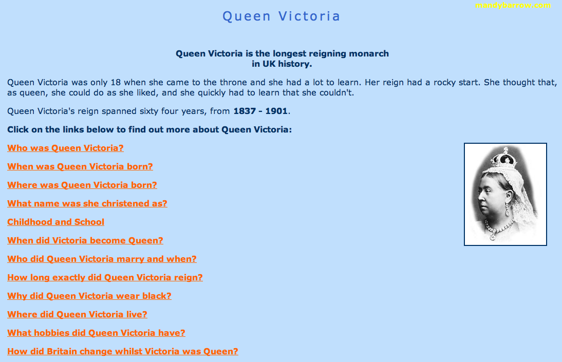 A great resource bank that answers many of the questions your children may want to know about Queen Victoria. A useful point of reference for your class to visit.