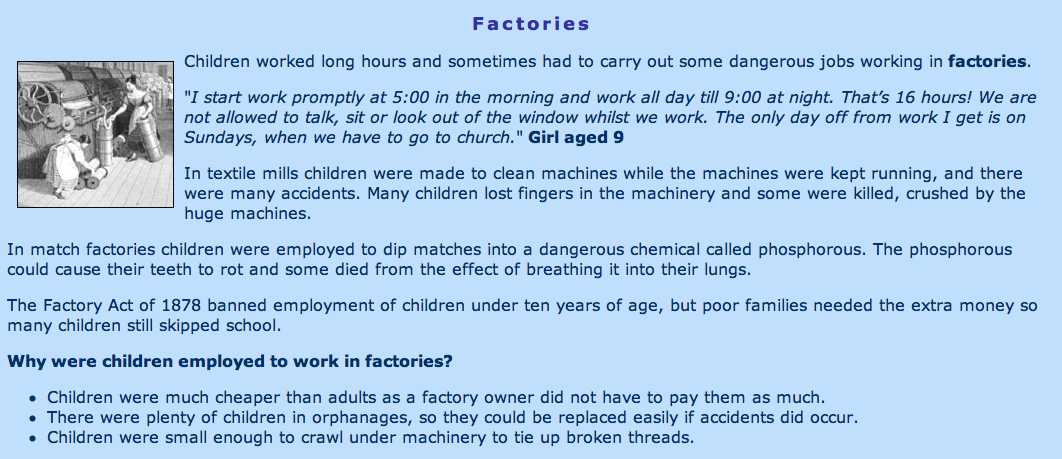 Children were often forced to work almost as soon as they could walk. This was not something new to the Victorian period as children had always been been expected to work for hundreds of years. Many were used as cheap labour.