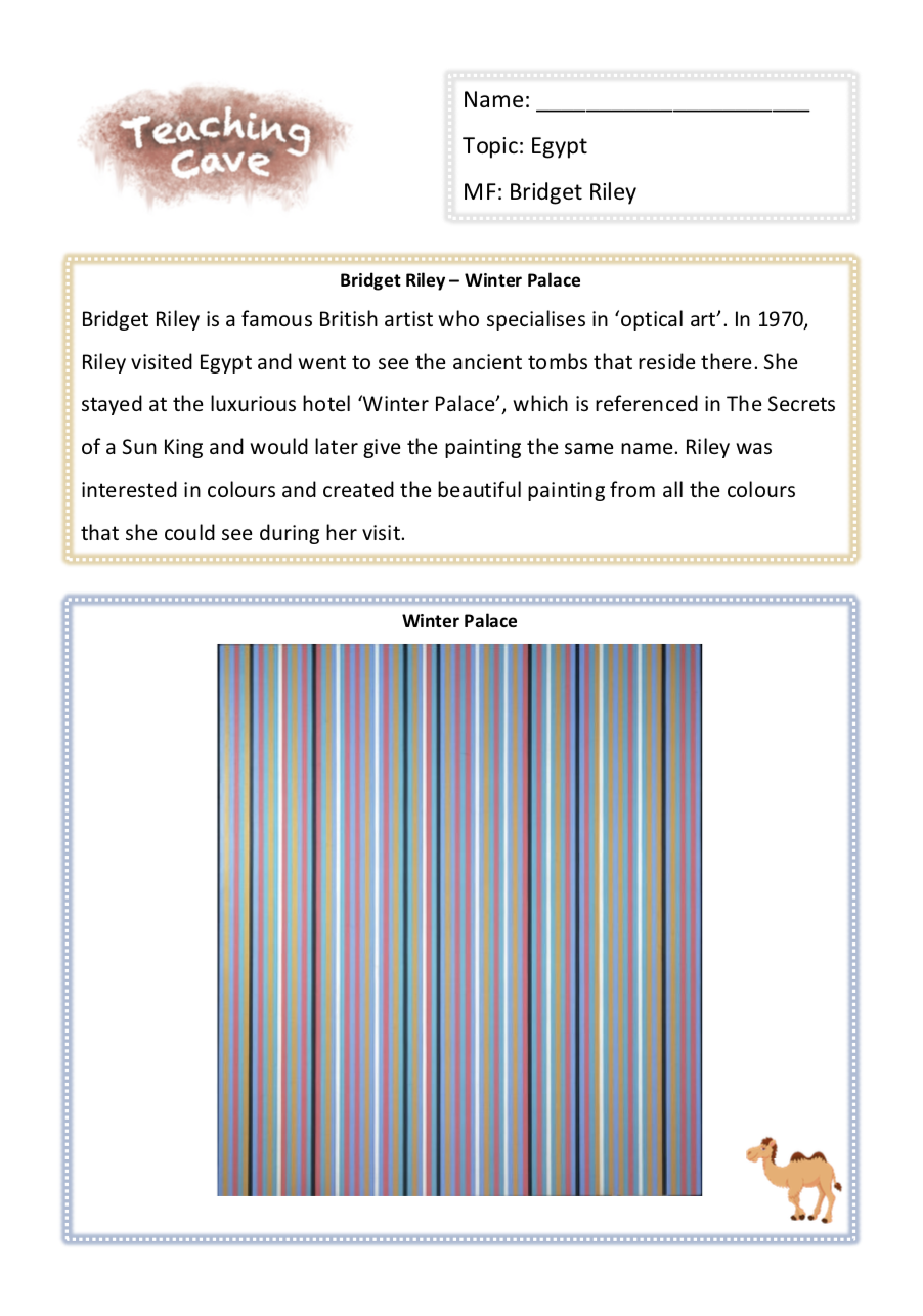 Bridget Riley is a famous British artist who specialises in ‘optical art’. In 1970, Riley visited Egypt and went to see the ancient tombs that reside there. She stayed at the luxurious hotel ‘Winter Palace’, which is referenced in The Secrets of a Sun King and would later give the painting the same name. Riley was interested in colours and created the beautiful painting from all the colours that she could see during her visit.